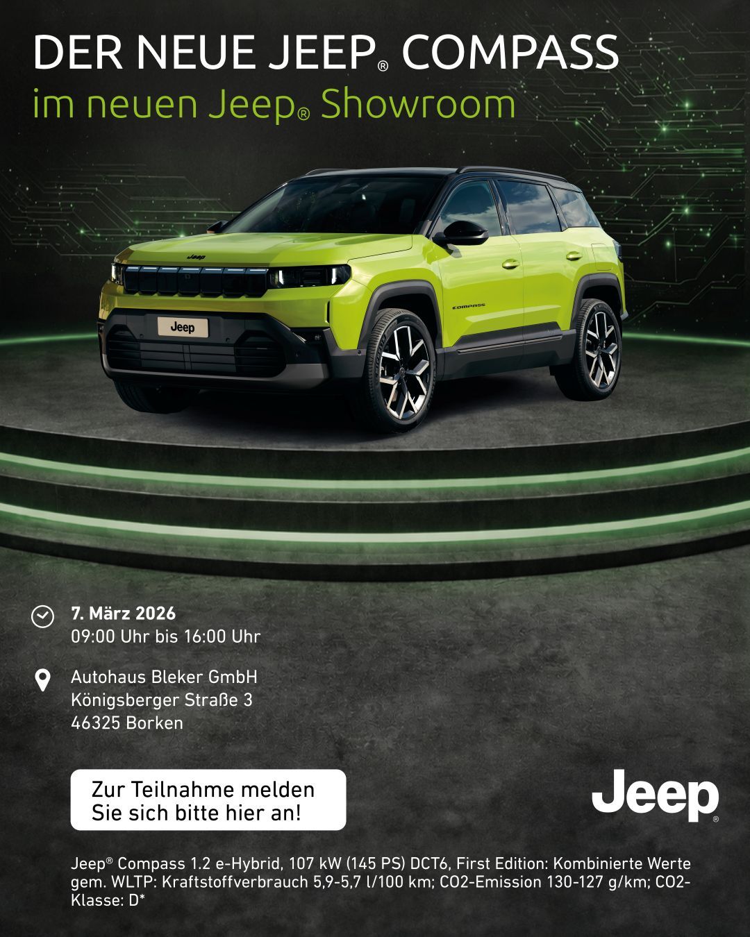 Ein Kilometerleasingangebot (Bonität vorausgesetzt) für Privatkunden der Stellantis Bank SA Niederlassung Deutschland, Siemensstraße 10, 63263 Neu-Isenburg gültig für nicht bereits zugelassene Neufahrzeuge. Die Angaben entsprechen zugleich dem 2/3 Beispiel nach § 6a Abs. 3 PAngV. Jeep® ist eine eingetragene Marke der FCA US LLC.