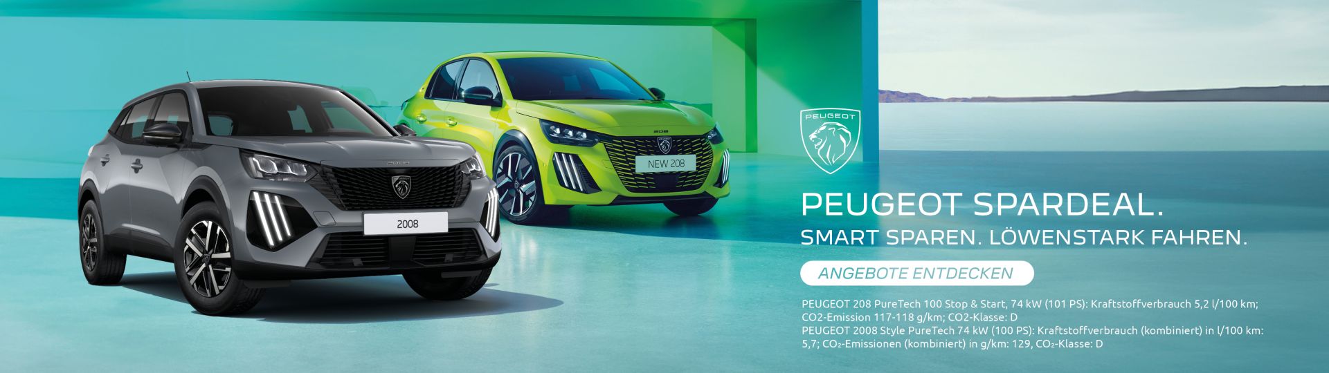 PEUGEOT 208 1.2 l PureTech 75 STOP & START, 74 kW (101 PS): Kraftstoffverbrauch (kombiniert) in l/100 km: 5,2; CO₂-Emissionen (kombiniert) in g/km: 118, CO₂-Klasse: D.*